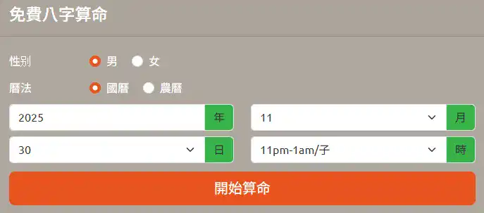 一樣的請輸入出生年月日,若不知道出生時間的話也沒關係,請先直接用預設的值帶入查詢即可,日主查詢只需精確到年月日。